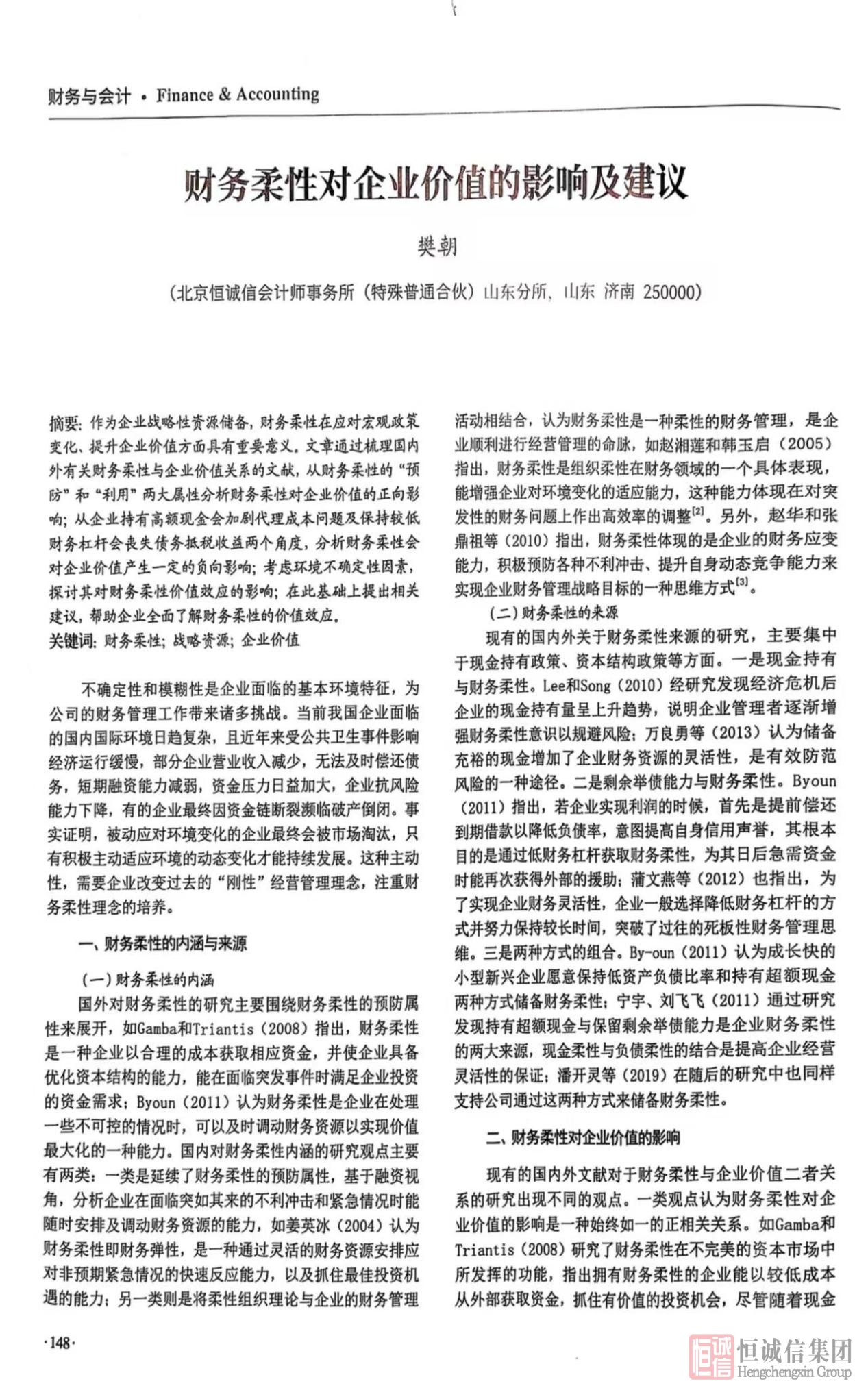 近日,北京恒誠信會計(jì)師事務(wù)所(特殊普通合伙)山東分所樊朝撰寫的學(xué)術(shù)論文《財(cái)務(wù)柔性對企業(yè)價值的影響及建議》,在省級期刊《知識經(jīng)濟(jì)》的 “財(cái)務(wù)與會計(jì)” 板塊成功發(fā)表。這一成果不僅是樊朝個人學(xué)術(shù)研究能力的體現(xiàn),更是恒誠信會計(jì)師事務(wù)所重視專業(yè)人才培養(yǎng)、推動學(xué)術(shù)研究與知識創(chuàng)新的有力見證。