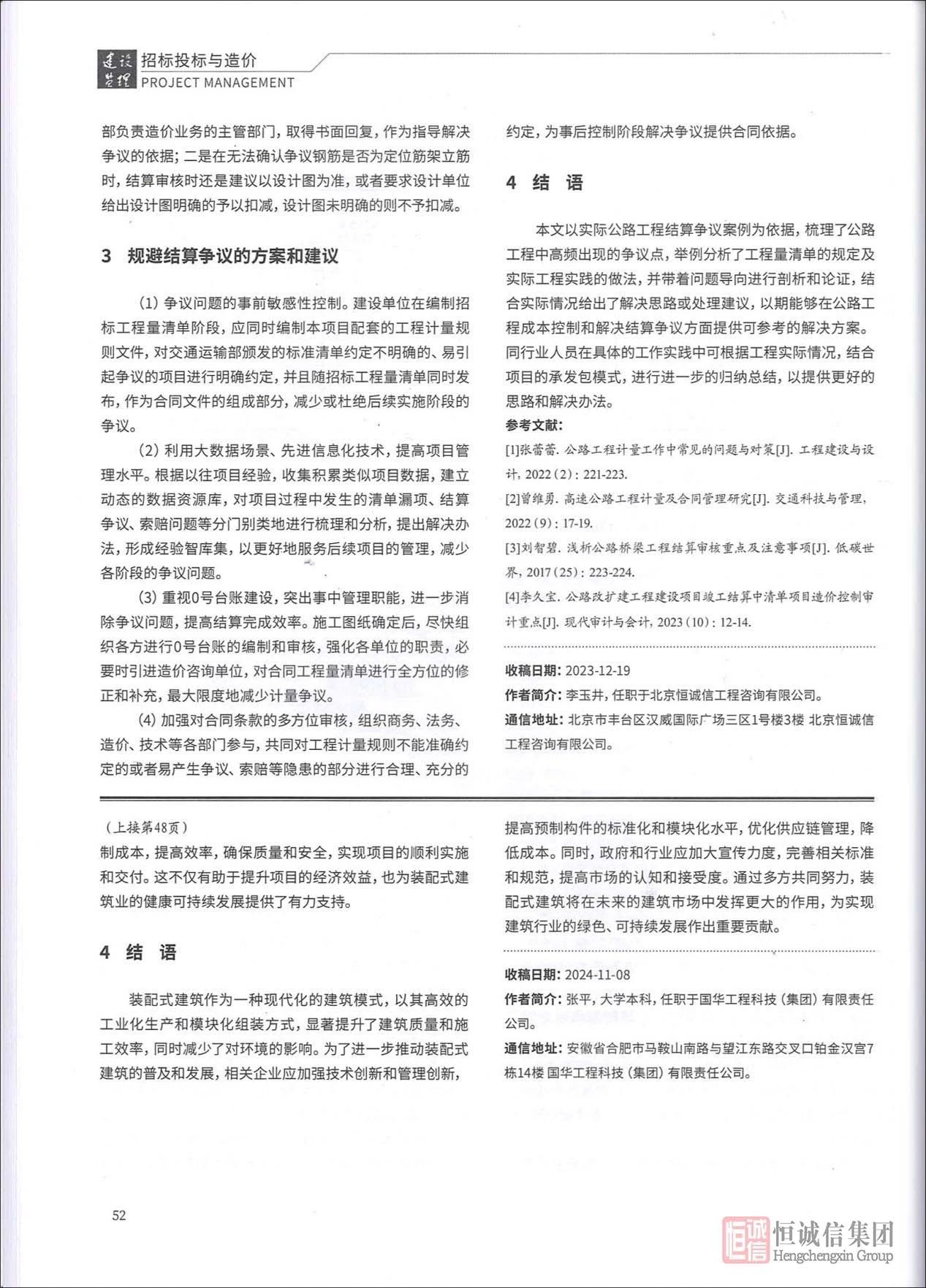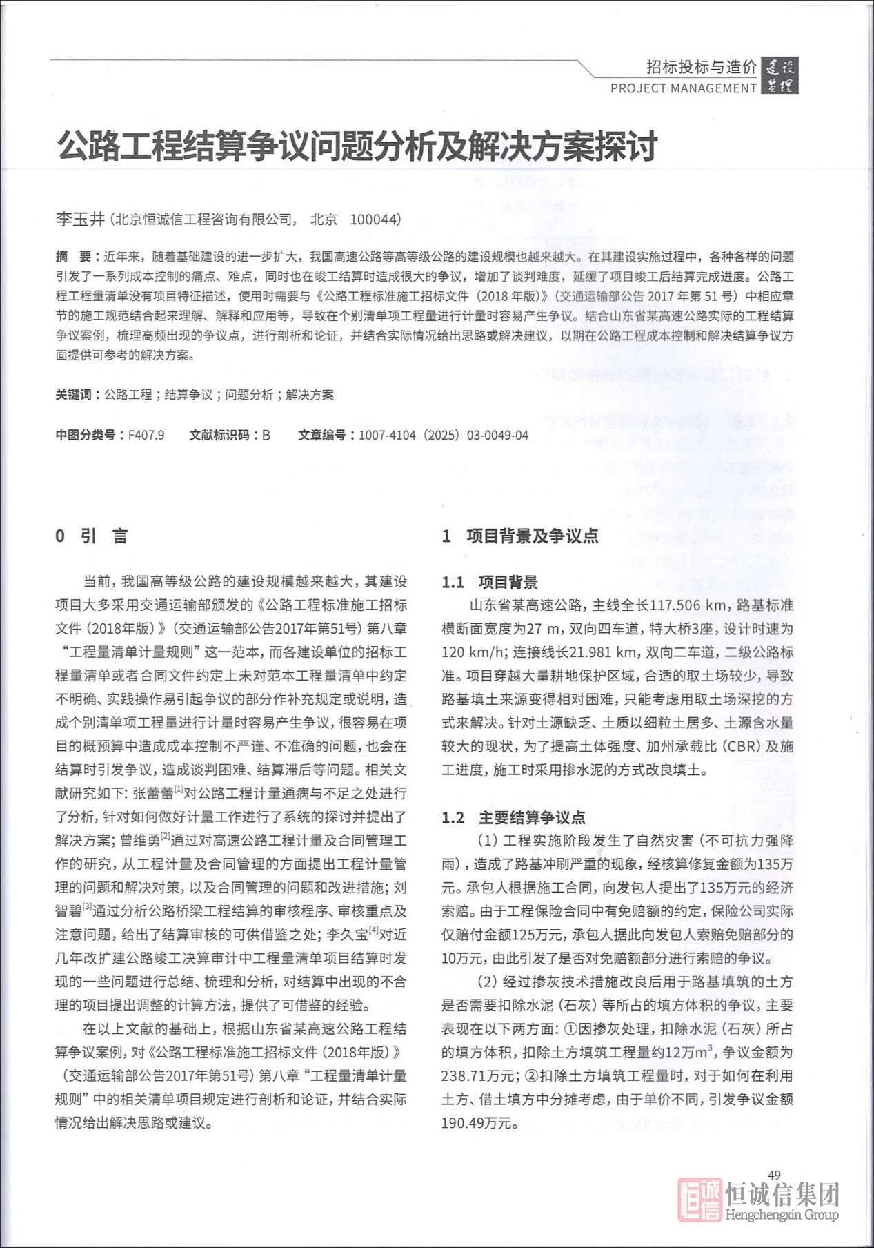 近日,恒誠信集團(tuán)技術(shù)部總經(jīng)理李玉井的學(xué)術(shù)成果《公路工程結(jié)算爭議問題分析及解決方案探討》在工程建設(shè)領(lǐng)域核心期刊《建設(shè)監(jiān)理》(Project Management)2025年第3期"招標(biāo)投標(biāo)與造價(jià)"專欄正式刊發(fā)。
