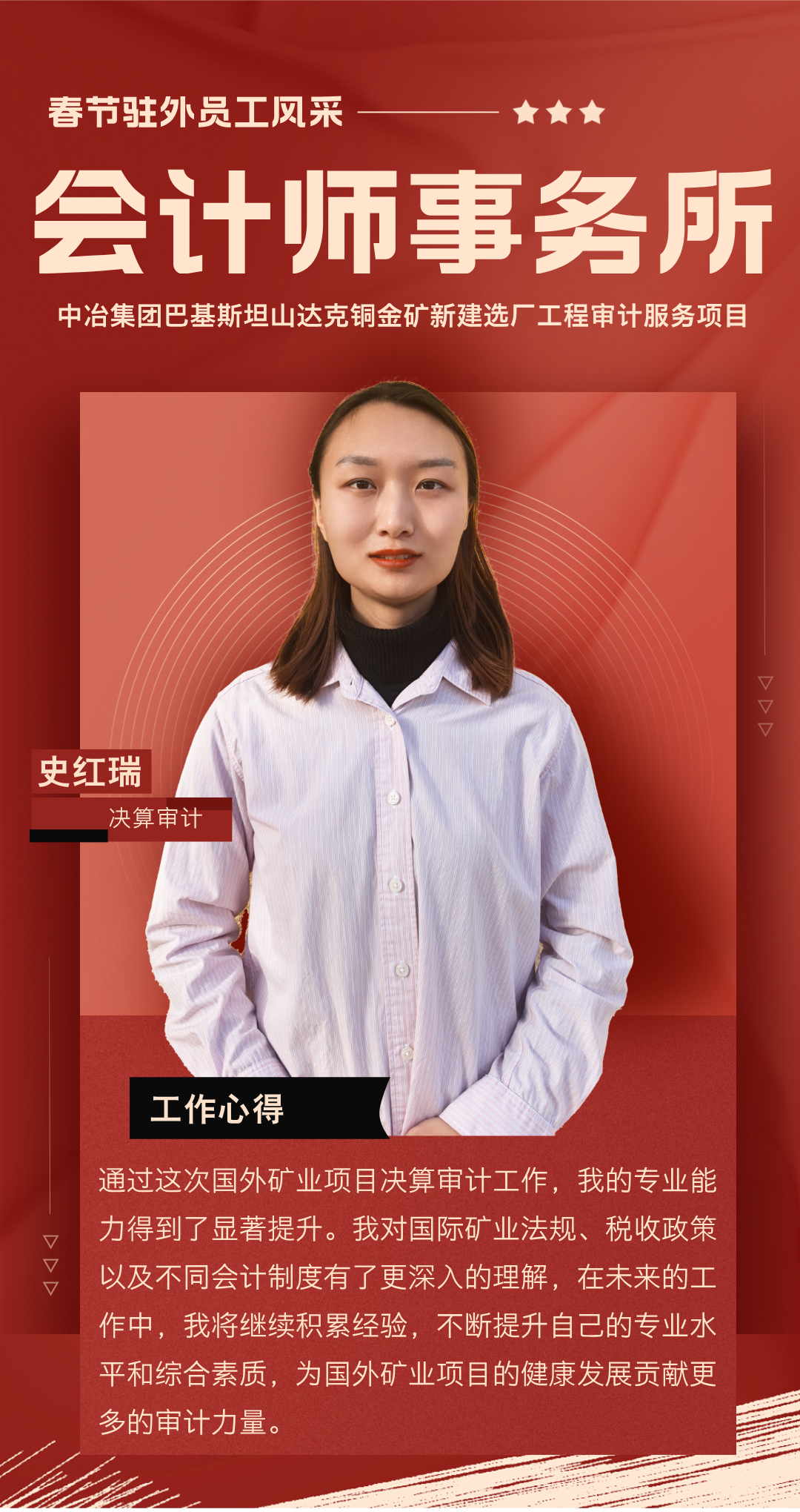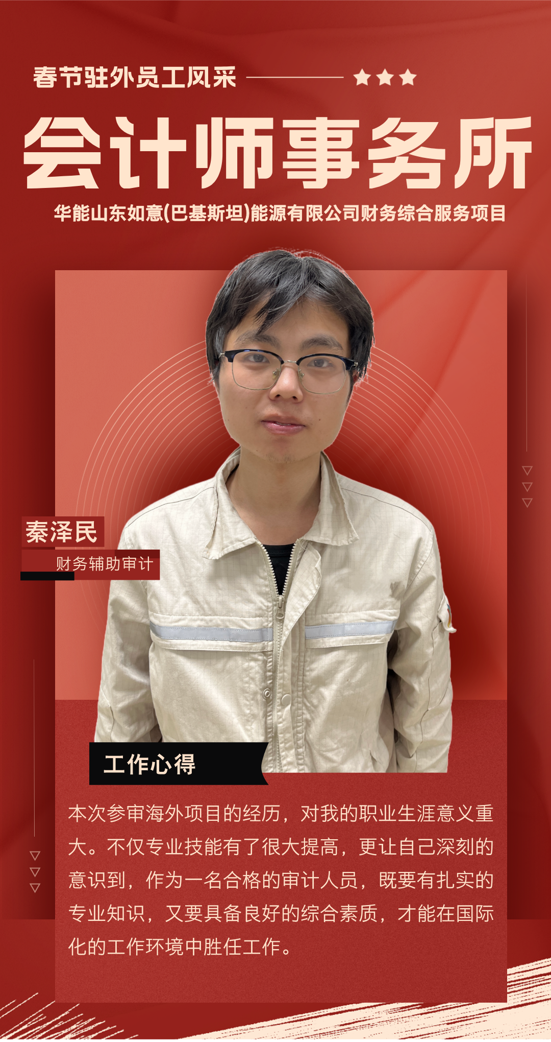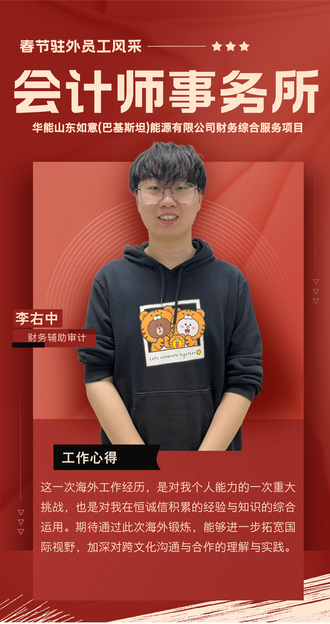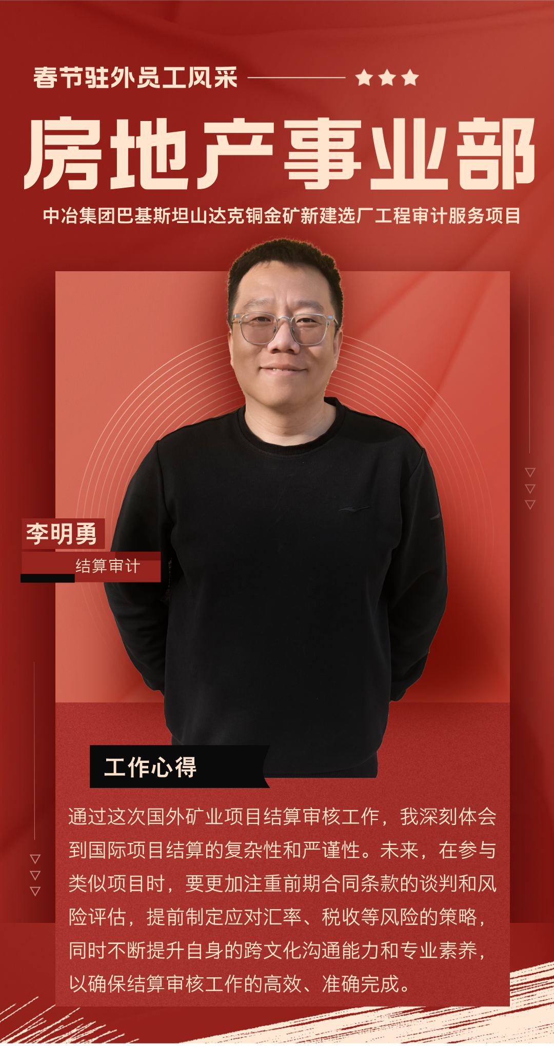 過去一年,你們背井離鄉(xiāng),奔赴海外項目一線,勇挑集團(tuán)賦予的重任,在異國他鄉(xiāng)的土地上默默耕耘。你們憑借扎實(shí)的專業(yè)知識,為項目的穩(wěn)步推進(jìn)筑牢根基;用非凡的智慧與辛勤的汗水,為公司贏得了良好聲譽(yù);更以實(shí)際行動,深刻詮釋了恒誠信人應(yīng)有的責(zé)任與擔(dān)當(dāng)。你們以精湛的專業(yè)服務(wù)在項目咨詢和審計工作中實(shí)現(xiàn)突破,樹立了恒誠信不畏艱險、攻堅克難、善作善成的企業(yè)品牌。廣大員工家屬識大體、顧大局,精心操持家庭、勇于承擔(dān)重負(fù),全力排解后顧之憂,給予駐外員工開拓進(jìn)取、再創(chuàng)佳績的信心與勇氣。